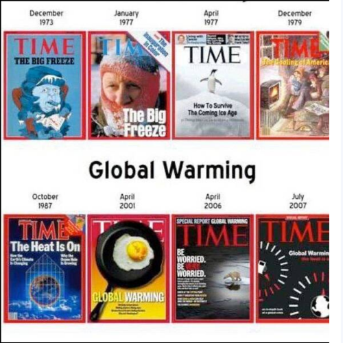 die Klima - Lüge:..u.A. daß alle paar Jahre entweder von einer "neuen Eiszeit" oder einem "Verglühen des Planeten" schwadroniert wird :