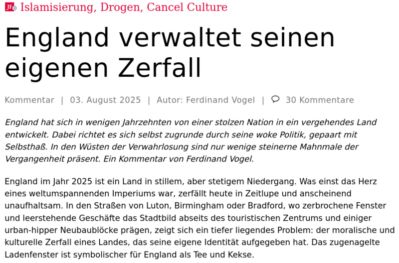 England im Jahr 2025 ist ein Land in stillem, aber stetigem Niedergang. Was einst das Herz eines weltumspannenden Imperiums war, zerfällt heute in Zeitlupe und anscheinend unaufhaltsam. In den Straßen von Luton, Birmingham oder Bradford, wo zerbrochene Fenster und leerstehende Geschäfte das Stadtbild abseits des touristischen Zentrums und einiger urban-hipper Neubaublöcke prägen, zeigt sich ein tiefer liegendes Problem: der moralische und kulturelle Zerfall eines Landes, das seine eigene Identität aufgegeben hat. Das zugenagelte Ladenfenster ist symbolischer für England als Tee und Kekse.