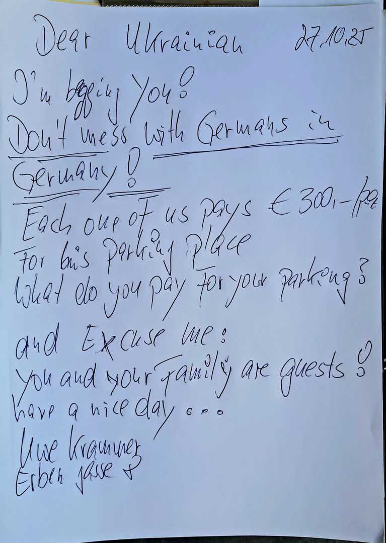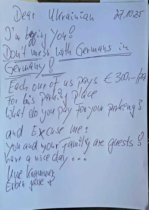 ...aber daß mich ein Ukrainer, der in dieser Straße wohnt und einen riesigen Hof zum Parken hat, daß der mich wiederholt anspricht, weil er mit seinem "E - Wagen" schlecht aus seiner Ausfahrt kommt, trotz riesiger Rückfahr - Kamera in