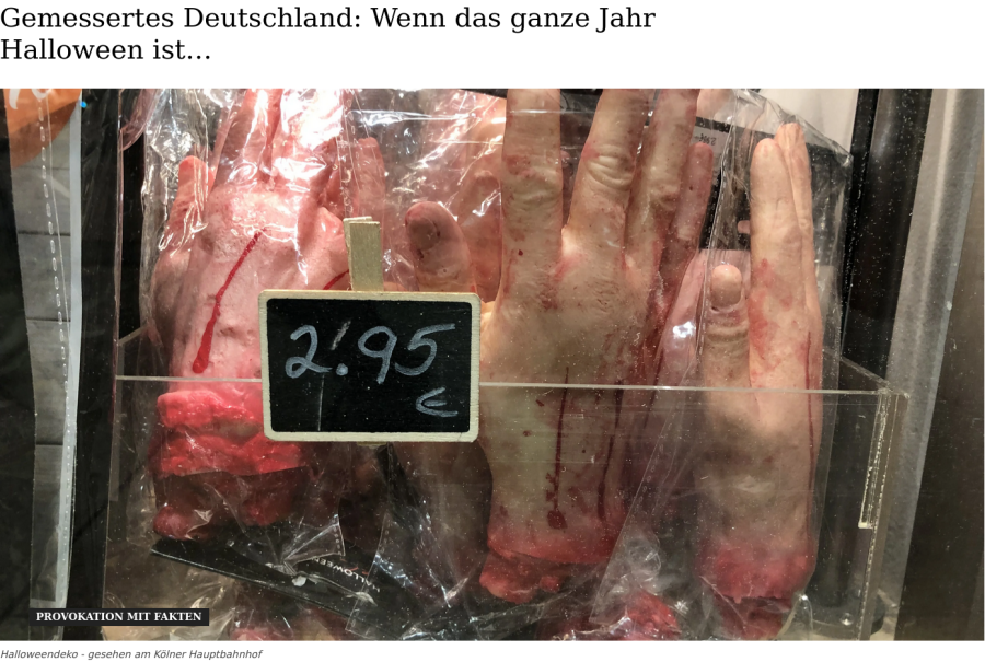 Abgeschnittene Arme im Souvenirladen am Kölner Hauptbahnhof und Kunstblut aus Drogeriemärkten sollen für ein gelungenes Halloweenfest am kommenden Donnerstag sorgen.