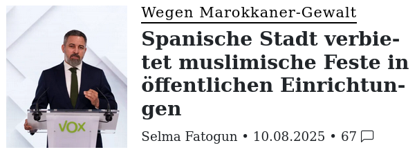 Es kommt zu massiver und unkontrollierter Einwanderung, die Unsicherheit verursacht, und das sage nicht ich, sondern das geht aus den Daten des Innenministeriums hervor. Demzufolge stellen Marokkaner und Algerier (ohne „Eingebürgerte“) zwei Prozent der Gesamtbevölkerung Spaniens. Marokkaner haben eine Kriminalitätsrate von 4,5 Prozent. Algerier eine von 23 Prozent. Ein Marokkaner begeht 7,1 mal mehr Straftaten als ein Spanier, ein Algerier sogar 37,2 mal so viele. Und es geht nicht darum, jemanden herauszugreifen, aber die Daten liegen vor, und das offensichtliche Problem ist da.